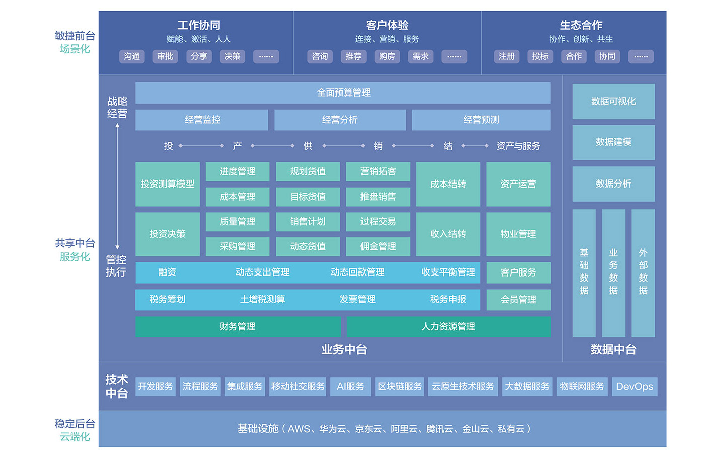 金蝶房地產(chǎn)企業(yè)數(shù)字化轉(zhuǎn)型解決方案從客戶、員工、企業(yè)的視角融合數(shù)字化技術與企業(yè)管理思想,幫助房地產(chǎn)企業(yè)建立新的核心競爭力,實現(xiàn)產(chǎn)品、業(yè)態(tài)、模式的創(chuàng)新。敏捷前臺為員工伙伴提供場景化、移動化的協(xié)同工作平臺。智能中臺構(gòu)建以數(shù)據(jù)為驅(qū)動的業(yè)務過程管控與共享服務,實現(xiàn)基于數(shù)據(jù)的智能決策。穩(wěn)定后臺為企業(yè)數(shù)字化轉(zhuǎn)型提供穩(wěn)定、靈活、安全的平臺支撐