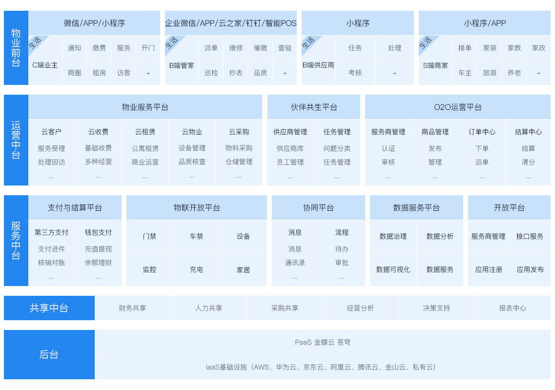我家云深度融合“互聯(lián)網(wǎng)+”,構(gòu)建物業(yè)產(chǎn)業(yè)服務(wù)云,前臺為業(yè)主、員工、客戶、伙伴、商家提供場景化、移動化的協(xié)同工作平臺;運(yùn)營中臺為物業(yè)企業(yè)、伙伴、商家提供數(shù)字化業(yè)務(wù)運(yùn)營管控支撐;服務(wù)中臺為業(yè)務(wù)運(yùn)營平臺提供高效的智能化共享服務(wù);穩(wěn)定后臺為物業(yè)企業(yè)數(shù)字化轉(zhuǎn)型提供穩(wěn)定、安全的平臺支撐。 我家云還支持金蝶云蒼穹物業(yè)版,快速搭建基于PaaS平臺的全新物業(yè)產(chǎn)業(yè)服務(wù)云平臺,解決大型物業(yè)企業(yè)個性化開發(fā)和效率提升的問題,通過平臺能力為用戶提供生態(tài)化產(chǎn)品解決方案,為伙伴提供生態(tài)化平臺解決方案。 |